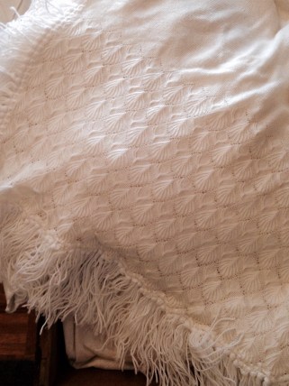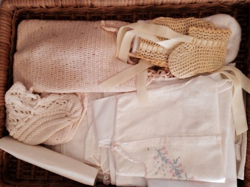 There are other things in the Trunk: my mom’s wedding dress and shoes, the baby layette, the white blanket she made to wrap her newborn babies in, coming home from the hospital. My mom’s first birthday party dress is in there too, along with all our First Communion dresses and suits, and the christening gown my siblings and I (and most recently, my nephew) were baptized in. It’s still good as new, ready for the next baby whenever he or she arrives.
