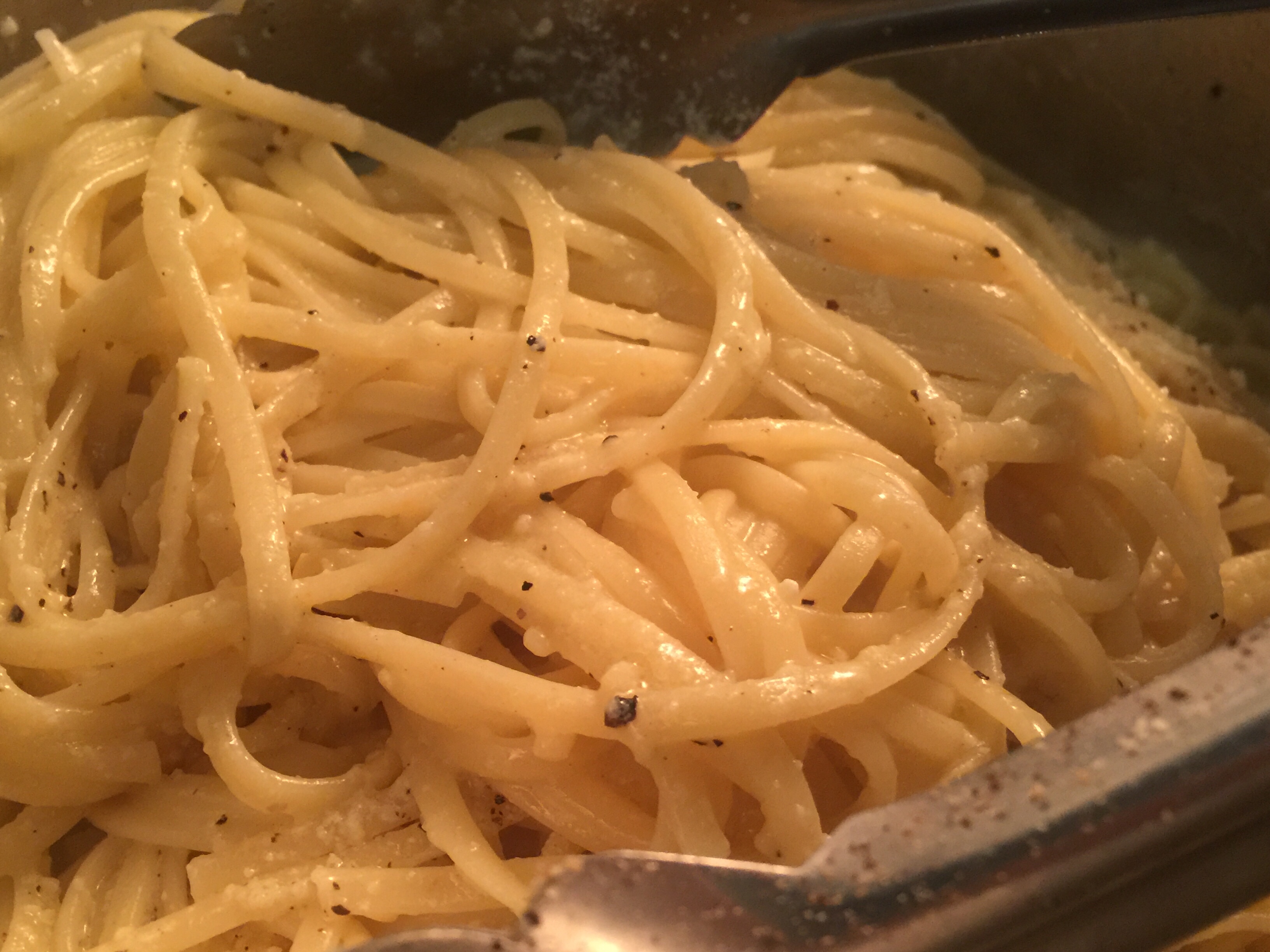 3. Drain the pasta in a colander and dump it back on the pot. Drop in the butter, oil and 1/2 tablespoon pepper and stir with tongs or a large fork, lifting and folding the pasta together. Add about 1/4 cup of the pasta water to the pot and place it over medium-high heat. Cook for a minute, stirring to emulsify the sauce. Test a noodle to see if it’s done. It should now be perfectly al dente. Remove from the heat and sprinkle half the cheese over the pasta. Blend once more, then serve with the rest of the cheese and pepper.