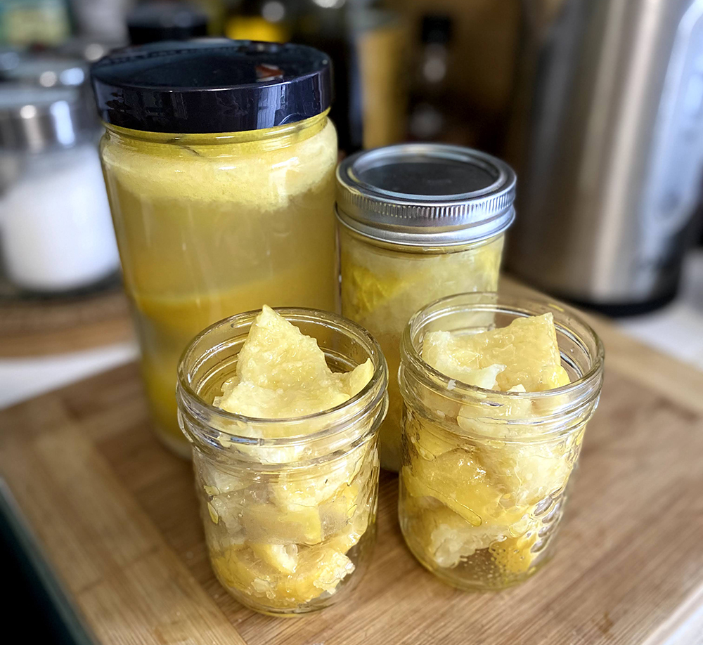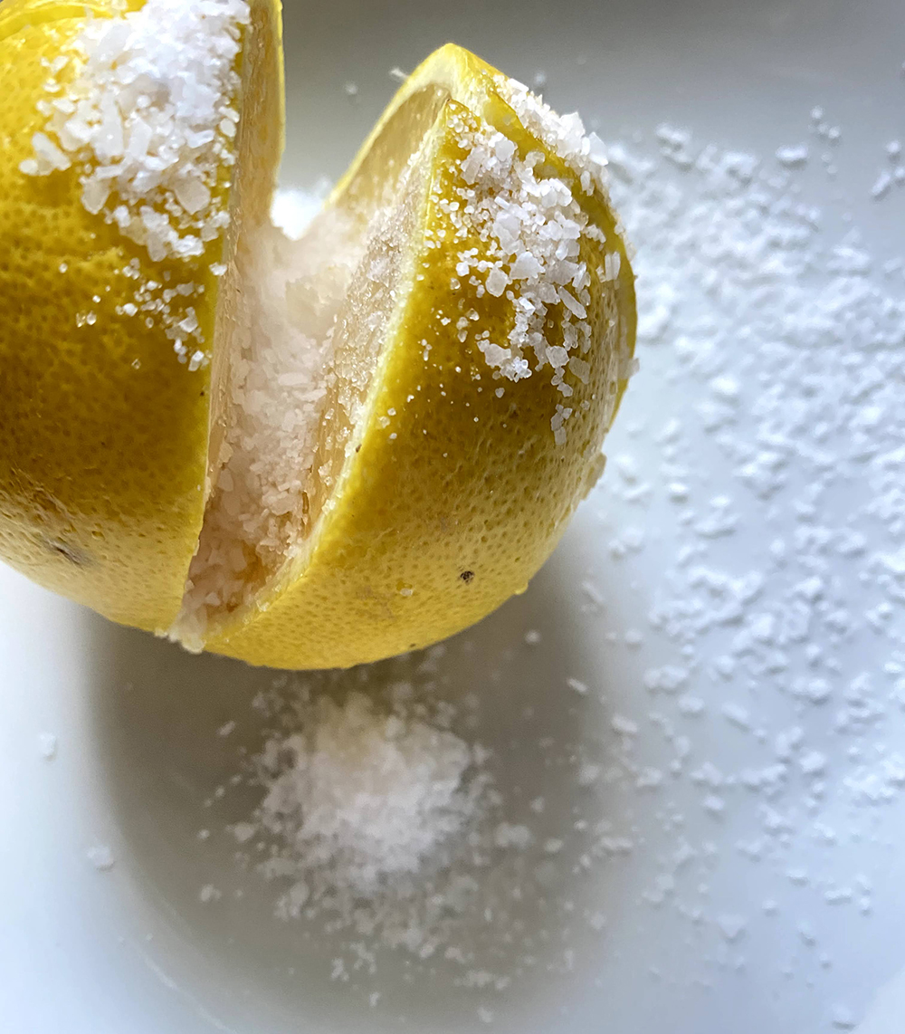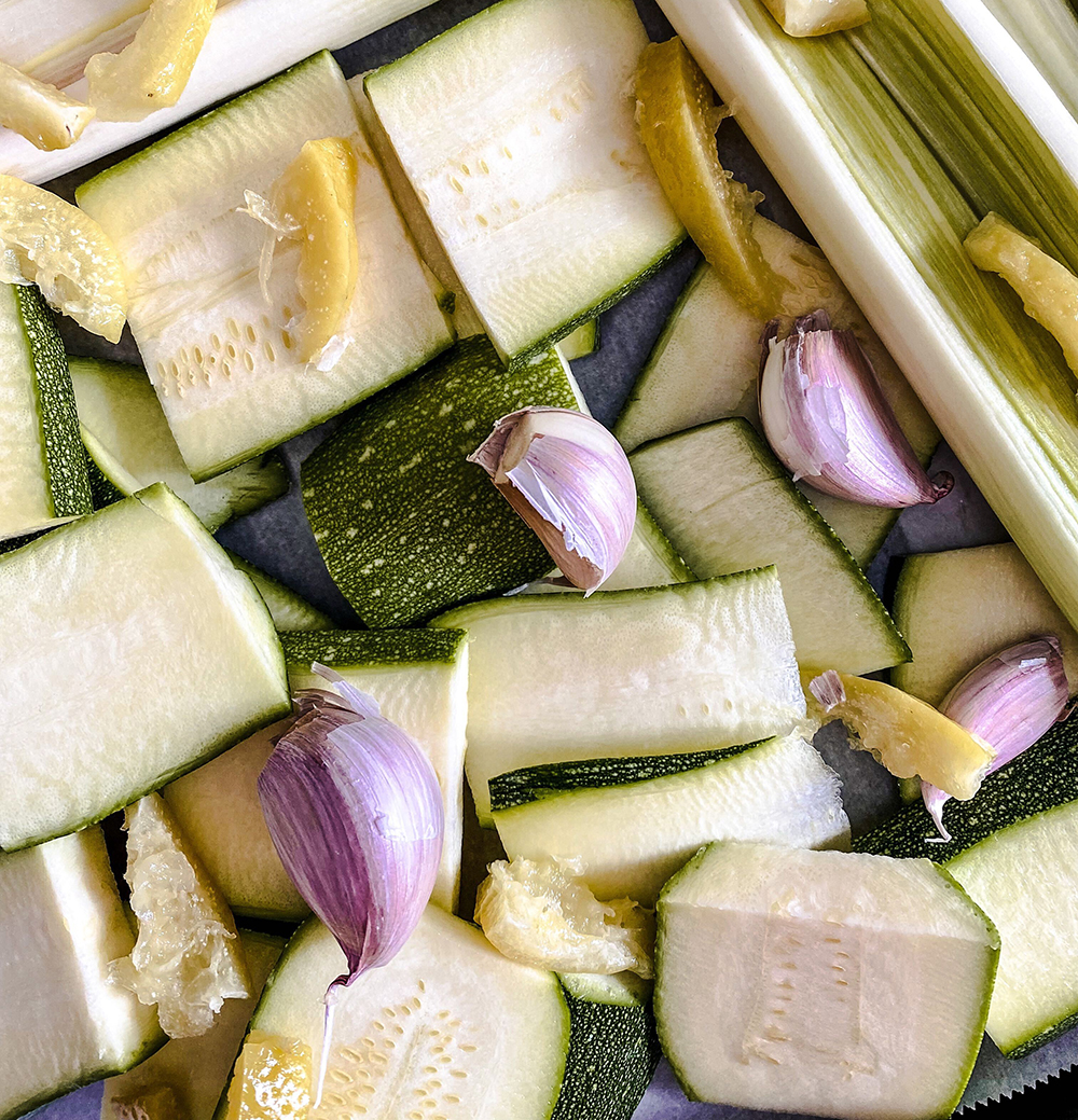 This summer I’m using two methods to preserve lemons. One involves boiling the lemon pieces and then preserving them in oil, which is a great way to use your lemon rinds instead of discarding them. You can keep them in the fridge and add slivers of lemon to all your dishes, as I’m doing today with a pan of roasted veggies.